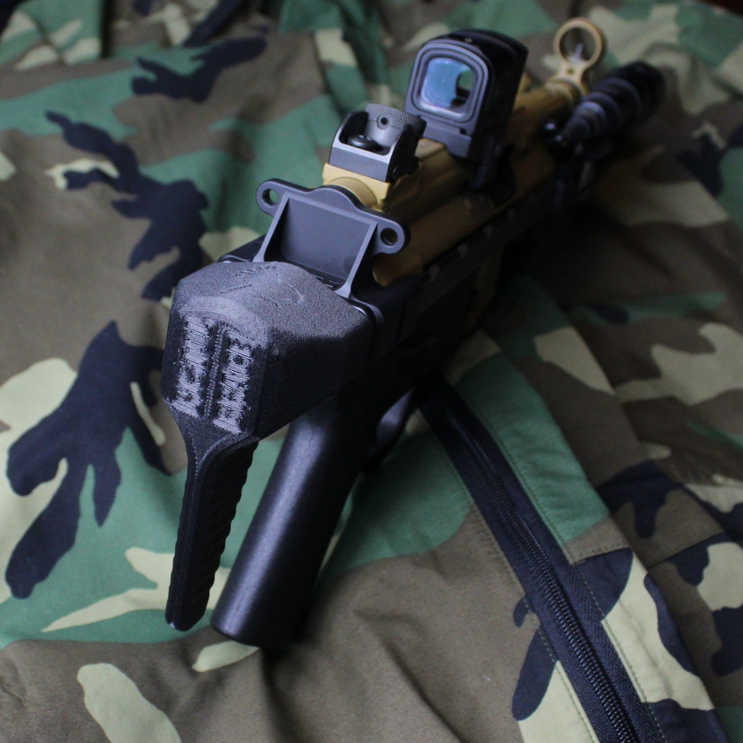 This is our HK MP5 brace. It’s manufactured from 3D printed impact resistant and durable carbon fiber filled nylon. This is an affordable, durable, light weight option compared to other aftermarket braces.